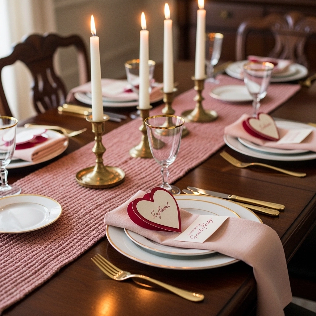 Design heart-shaped place cards for your dining table. Use textured cardstock for a premium feel. Write names in soft calligraphy style. The detail feels personal and thoughtful. It elevates even a simple dinner setup. Guests will notice the effort instantly.