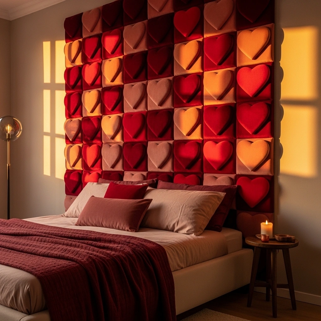 Create soft DIY velvet heart wall panels to add texture and depth to a blank wall. Cut large heart shapes from plywood or thick foam board and wrap them in velvet fabric. Choose rich tones like deep burgundy, dusty rose, or warm mauve for a cozy romantic look. The plush texture absorbs light beautifully and adds a soft shadow around each shape. When grouped together, the hearts create a layered feature wall that feels warm and intimate. This idea works especially well behind a bed, sofa, or reading nook.