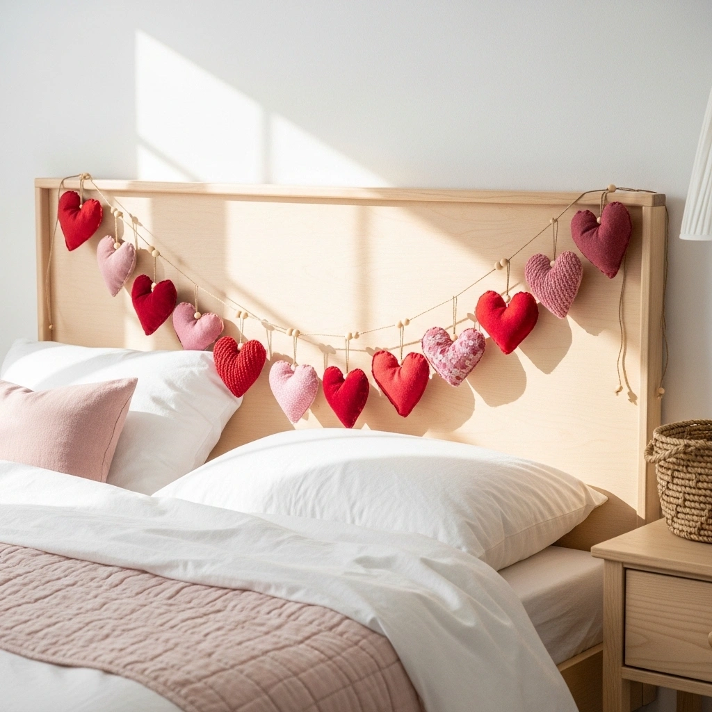 Make a soft fabric heart garland using velvet, linen, and cotton scraps. The mix of textures instantly adds depth and charm. Choose shades like dusty rose, deep red, cream, and soft mauve. When draped across a mantel or headboard, it creates a gentle romantic rhythm. The layered fabrics feel handmade and personal. This decoration brings warmth without feeling overly bright.