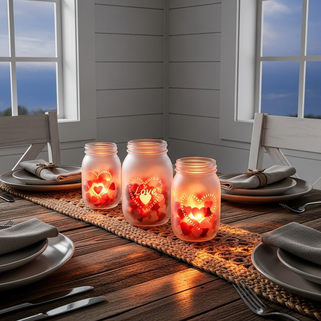 Turn simple mason jars into glowing Valentine lanterns. Frost the glass lightly using spray frost or diluted white paint. Add heart cut-outs on the outside for a glowing silhouette effect. When a candle shines inside, soft heart shapes appear around the room. The look feels dreamy and warm. It creates a cozy corner without much effort.
