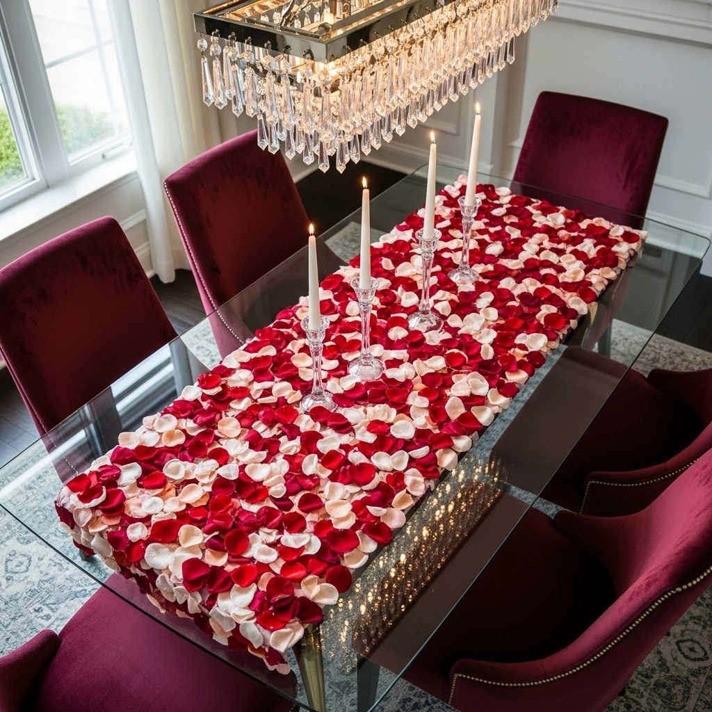 Use a neutral linen tablecloth underneath for balance. Add glass candle holders at different heights for visual interest. Keep plates and cutlery minimal to let the runner shine. You can lightly glue petals onto a strip of mesh for a cleaner look. This makes cleanup easier while keeping the romantic effect.