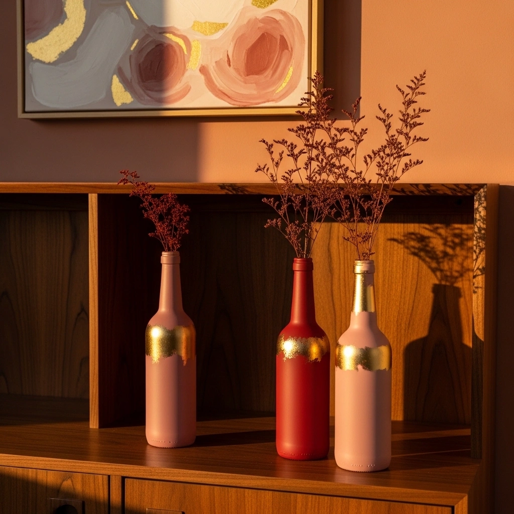 Transform empty glass bottles with blush and gold paint. Use matte blush as the base color. Add gold leaf or metallic paint around the neck for contrast. The mix of soft pink and warm gold feels romantic and modern. Grouped together, they create a chic centerpiece. This adds height and elegance to any surface.