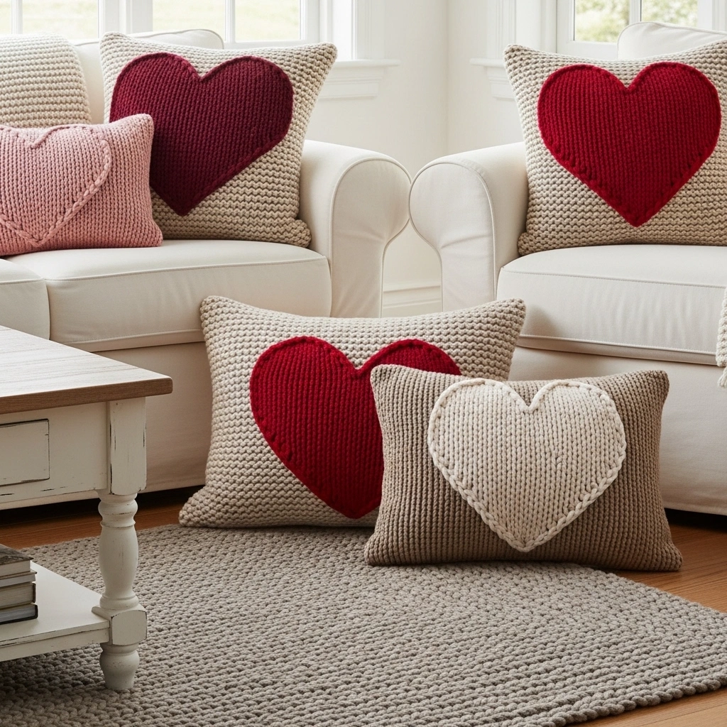 Sew or customize pillow covers with knit heart patches. Choose chunky knit fabric in cream or soft gray. Add a bold red or blush heart in the center. The texture contrast feels cozy and inviting. This instantly updates sofas or beds for Valentine’s Day. It keeps the look soft instead of overly themed.