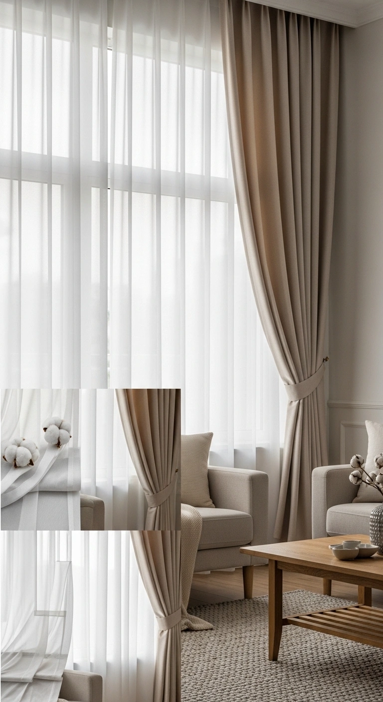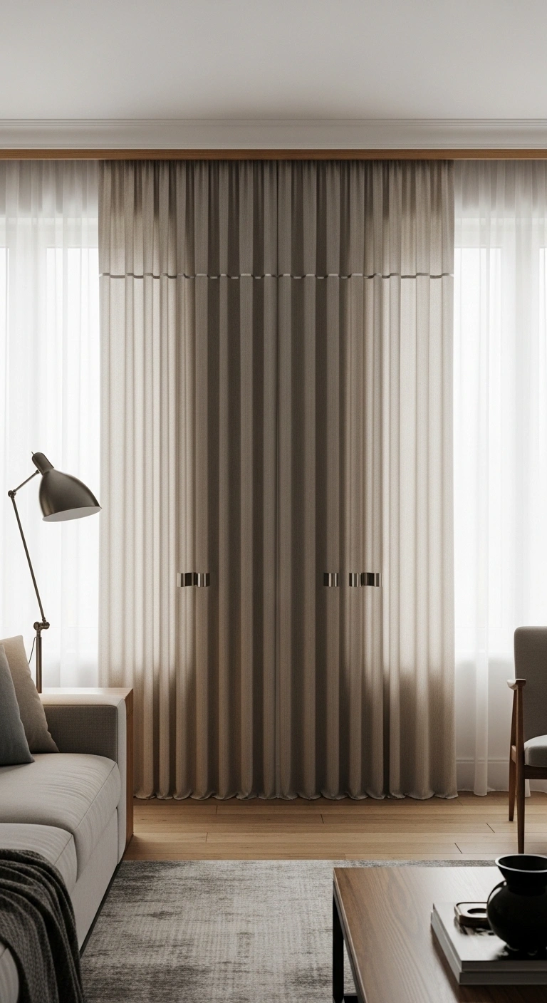 Choose neutral tones for both layers to keep the look calm and balanced, or mix soft contrast like white sheers with beige or gray outer panels. Use a double rod to keep everything neat and easy to adjust. Pair with textured rugs and soft cushions to echo the layered feel. This idea works well in bedrooms and living rooms where comfort and flexibility matter most, making your space feel complete and thoughtfully styled.