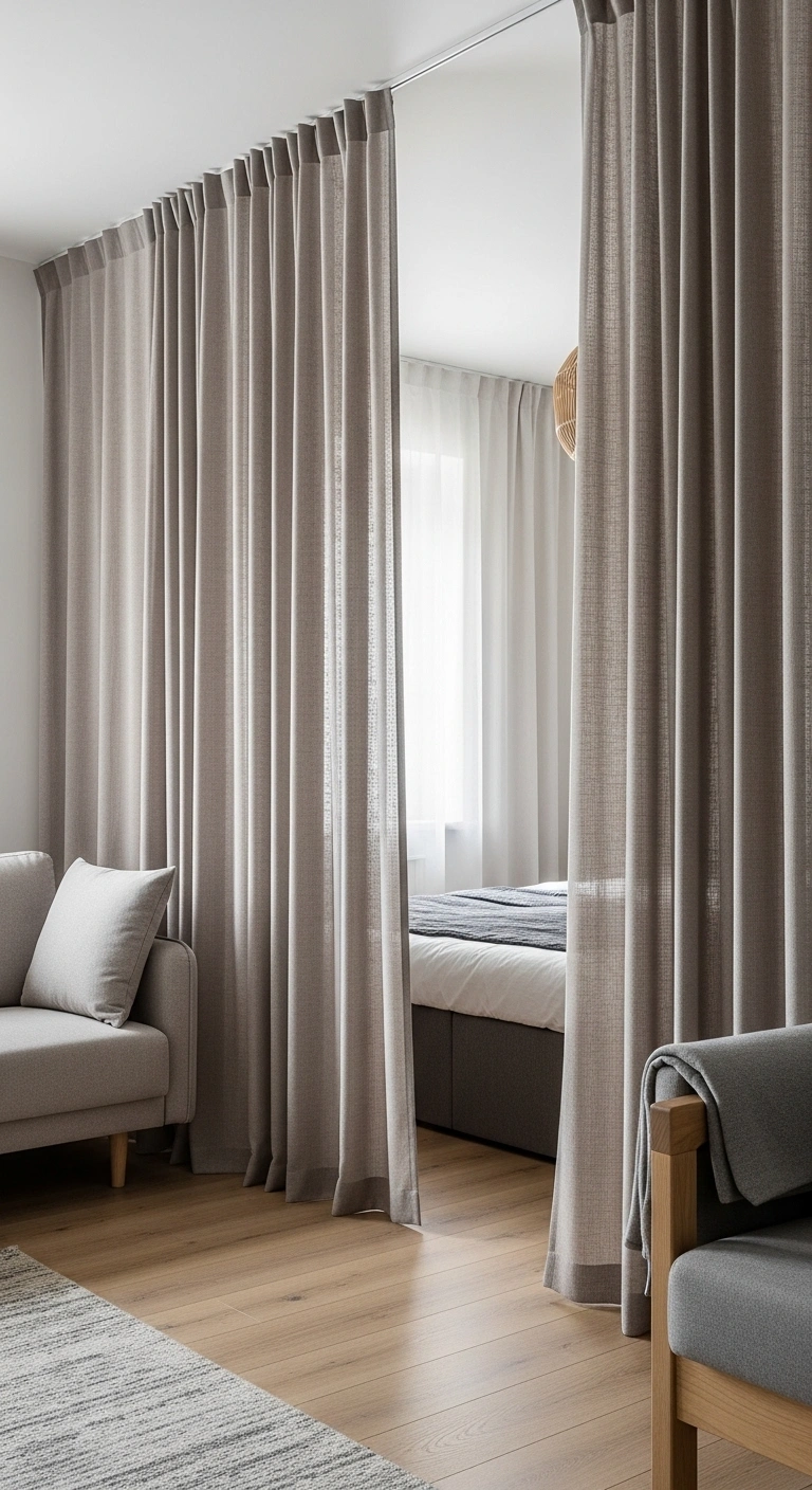 Choose thicker fabrics for more privacy or lighter ones for a softer divide. Install a ceiling track for smooth movement and a clean look. This idea works well in studios or shared spaces where flexibility is important. It adds function while keeping the space visually open and stylish.