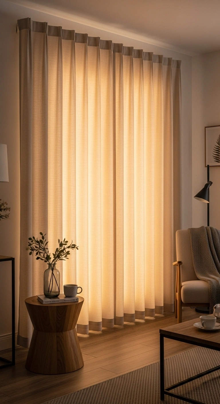 22. Soft Glow Curtains with Warm Lighting