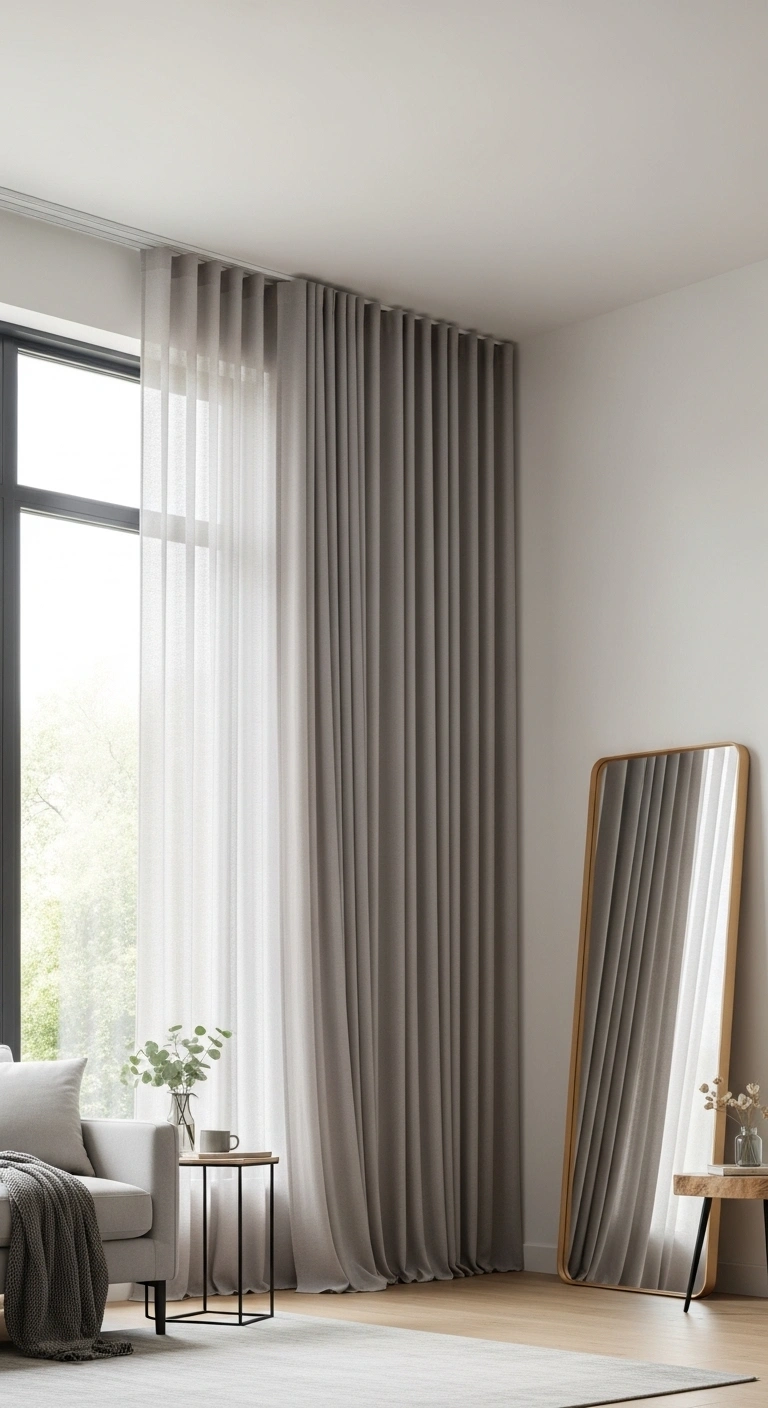Layering floor-to-ceiling curtains gives your space both style and function. Start with sheer panels closest to the window, then add heavier drapes on top. This setup lets you control light throughout the day while adding soft visual depth. The layers create a rich, cozy look without needing bold colors or patterns.