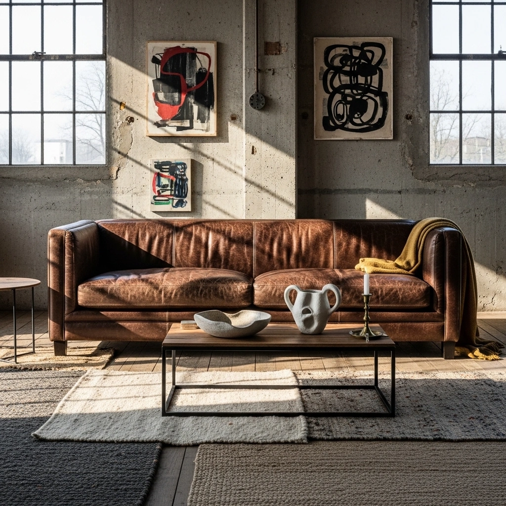 Style tips: place the sofa against a soft neutral wall, add patterned cushions or throws, and balance with wooden or brass side tables. Layer a textured rug underneath to anchor the space and soften the leather’s bold presence. A nearby floor lamp can complete the look.