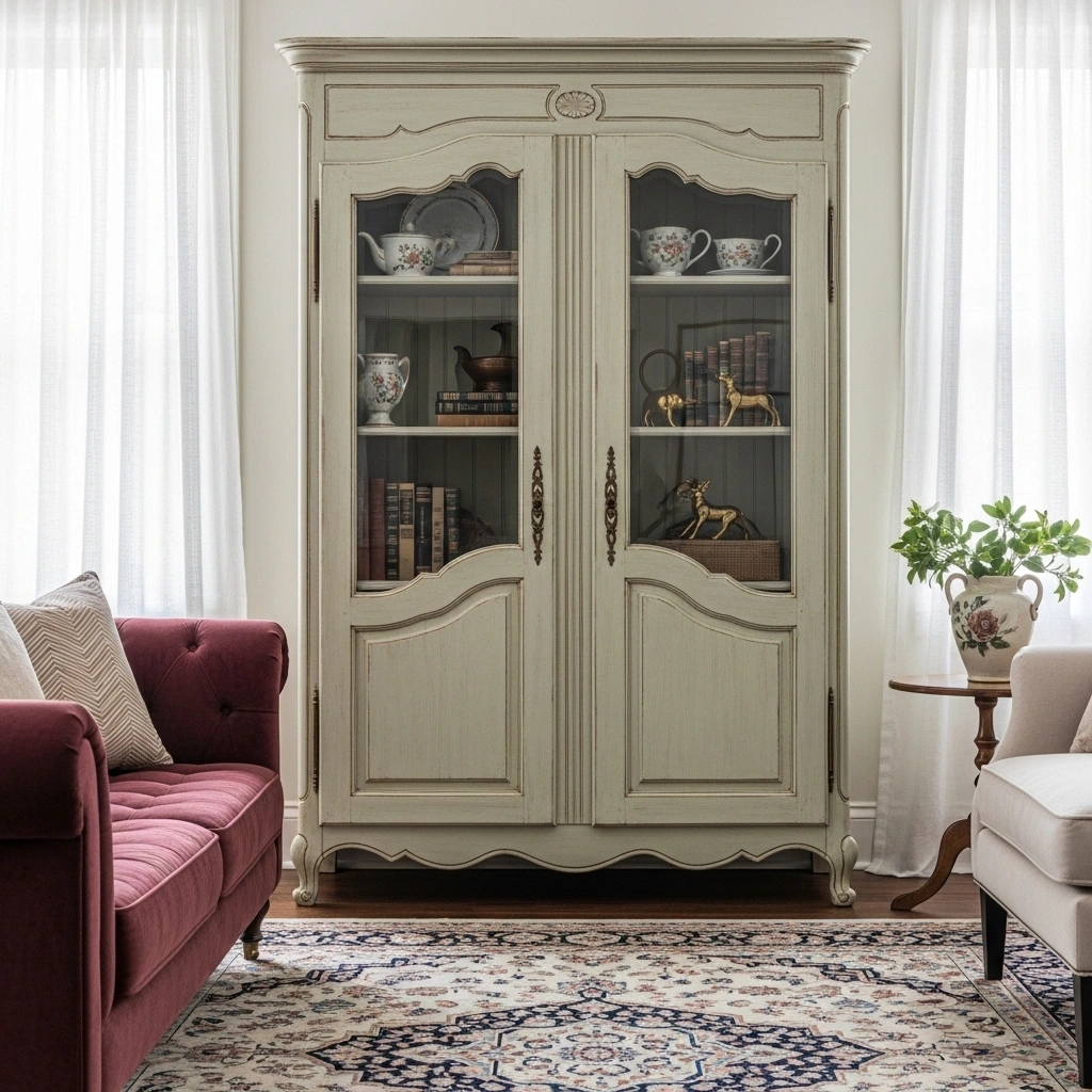 A vintage armoire or cabinet serves as both storage and a statement piece. Imagine carved wood, muted paints, or glass-paneled doors showcasing collectibles or books. Its presence adds height, texture, and historical charm to the room without cluttering the floor.