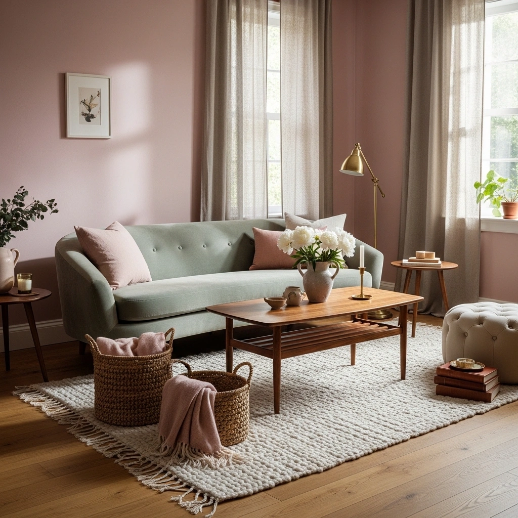 To recreate this at home, pair pastel throw pillows with a mid-century armchair or loveseat. Anchor the space with a wooden coffee table and layered rugs. Use cream curtains to soften light and add brass or ceramic accents to elevate the aesthetic. A small bookshelf or side table can bring additional texture, balancing the airy pastel hues with earthy warmth.