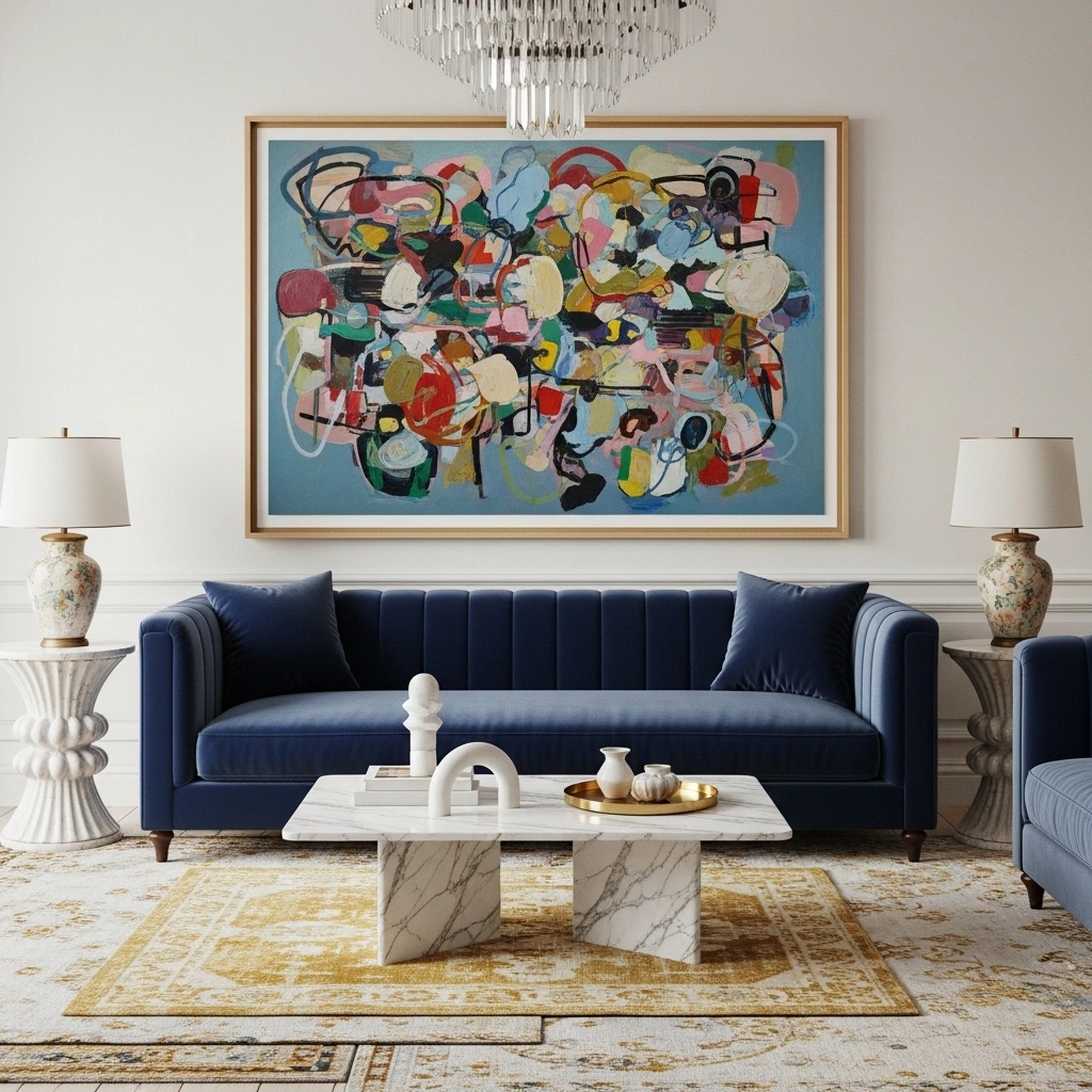 Apply this by positioning artwork above sofas, mantels, or sideboards. Mix frame textures—wood, brass, or gilded—to complement furniture and textiles. Balance with smaller decorative accents and lighting to ensure the artwork stands out, making your living room feel curated and soulful.