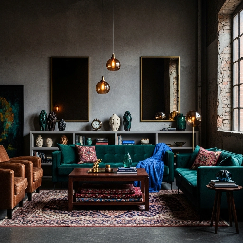Apply this by mixing jewel-toned cushions with gold-framed mirrors or artwork. Pair a velvet sofa with a leather ottoman or a patterned rug to ground the colors. Curtain fabrics in deep tones can frame windows elegantly, while small metallic or wooden accents add subtle shine and texture without overpowering the palette.