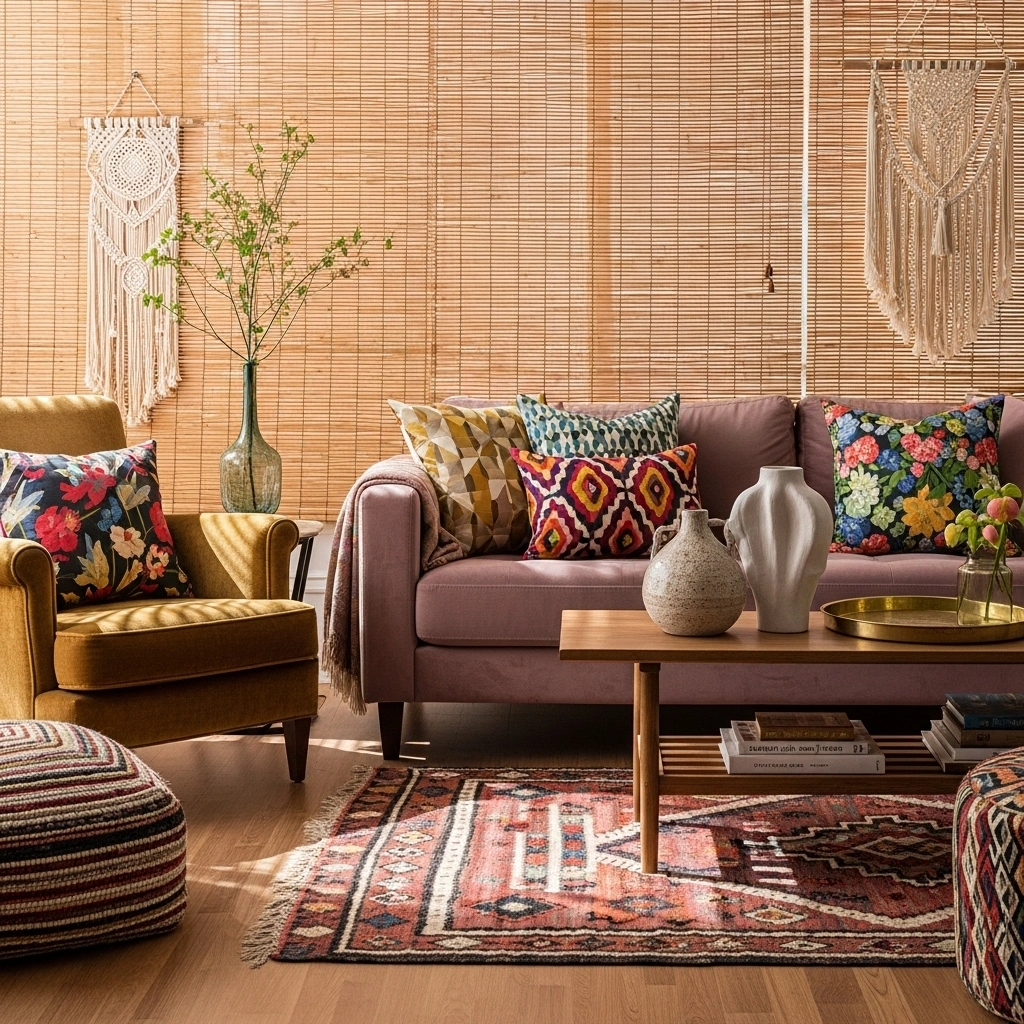 For practical use, pair geometric rugs with floral or patterned pillows. Add a leather pouf for extra texture and functionality, and drape velvet or silk throws across sofas or chairs. Combining contrasting textures carefully ensures the room feels balanced and lively, while maintaining a cohesive vintage aesthetic.