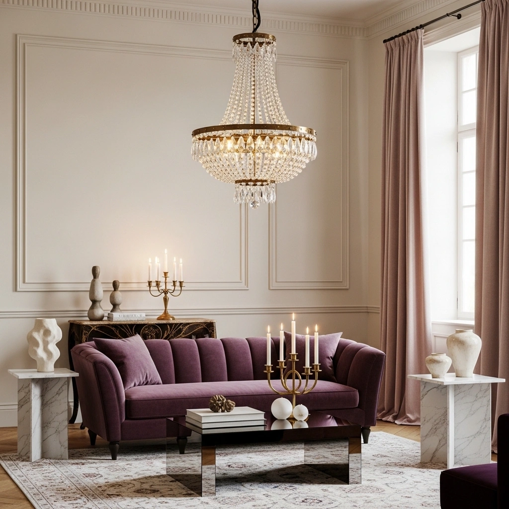 A vintage chandelier transforms the ceiling into a statement feature. Crystal or brass designs reflect light over plush seating, wooden floors, and layered rugs, adding elegance and warmth. The glow creates a soft, inviting ambiance, perfect for living rooms designed for conversation and relaxation.