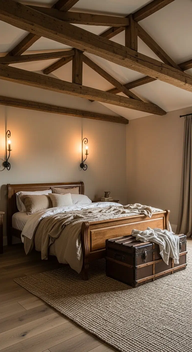 Rustic brown tones combined with exposed ceiling beams create cozy charm. The natural wood adds architectural interest and warmth. Pair darker beams with soft tan walls for balance. Add chunky knit blankets and linen bedding for comfort. The mix of raw wood and soft textiles feels welcoming. The overall vibe feels relaxed yet refined.