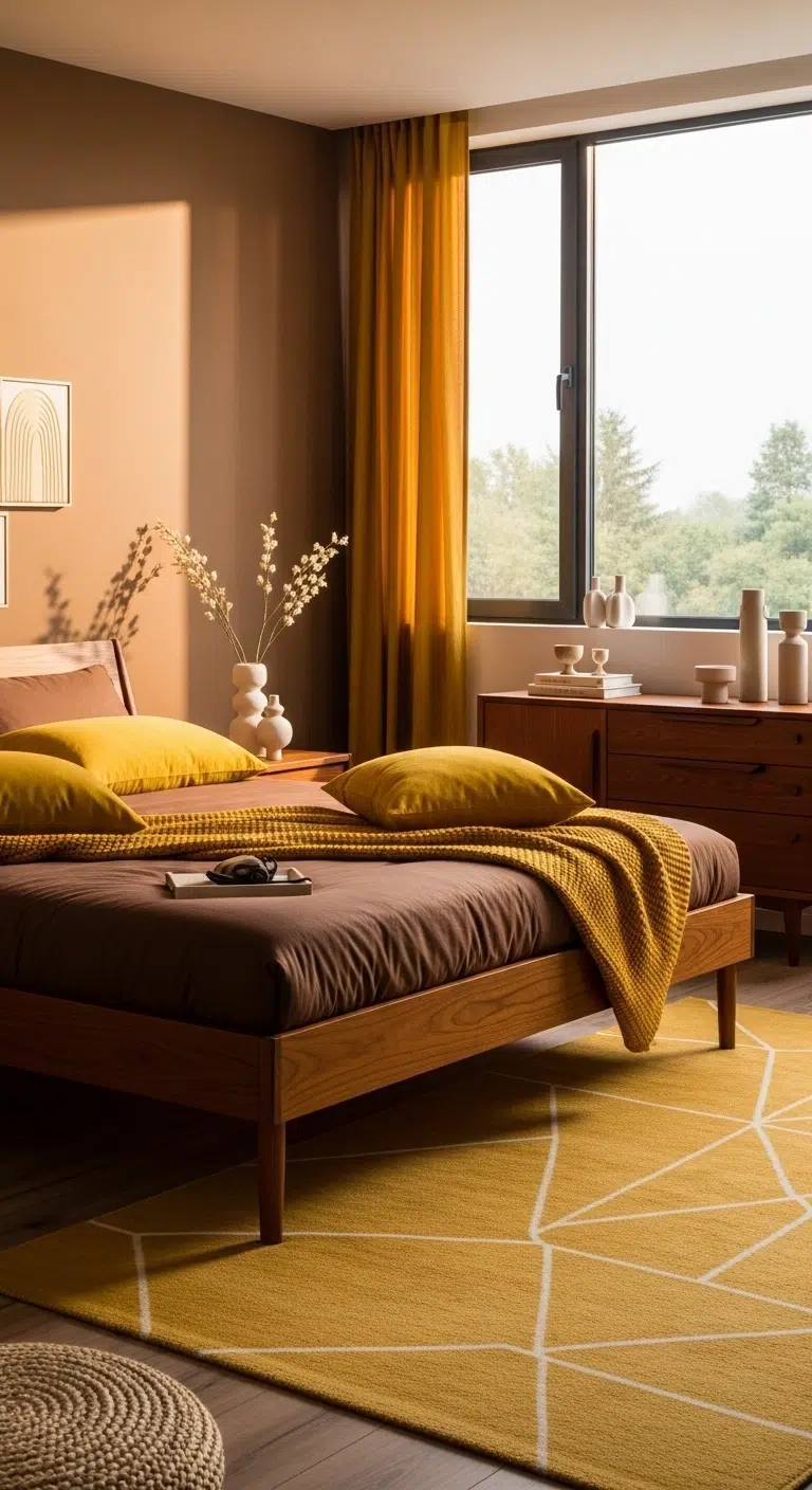 Brown paired with mustard accents adds a lively yet warm twist. The golden undertones of mustard brighten the richness of brown. Use mustard cushions or a throw against chocolate bedding. The contrast feels bold but balanced. Add wooden side tables for cohesion. The mood becomes energetic yet cozy.