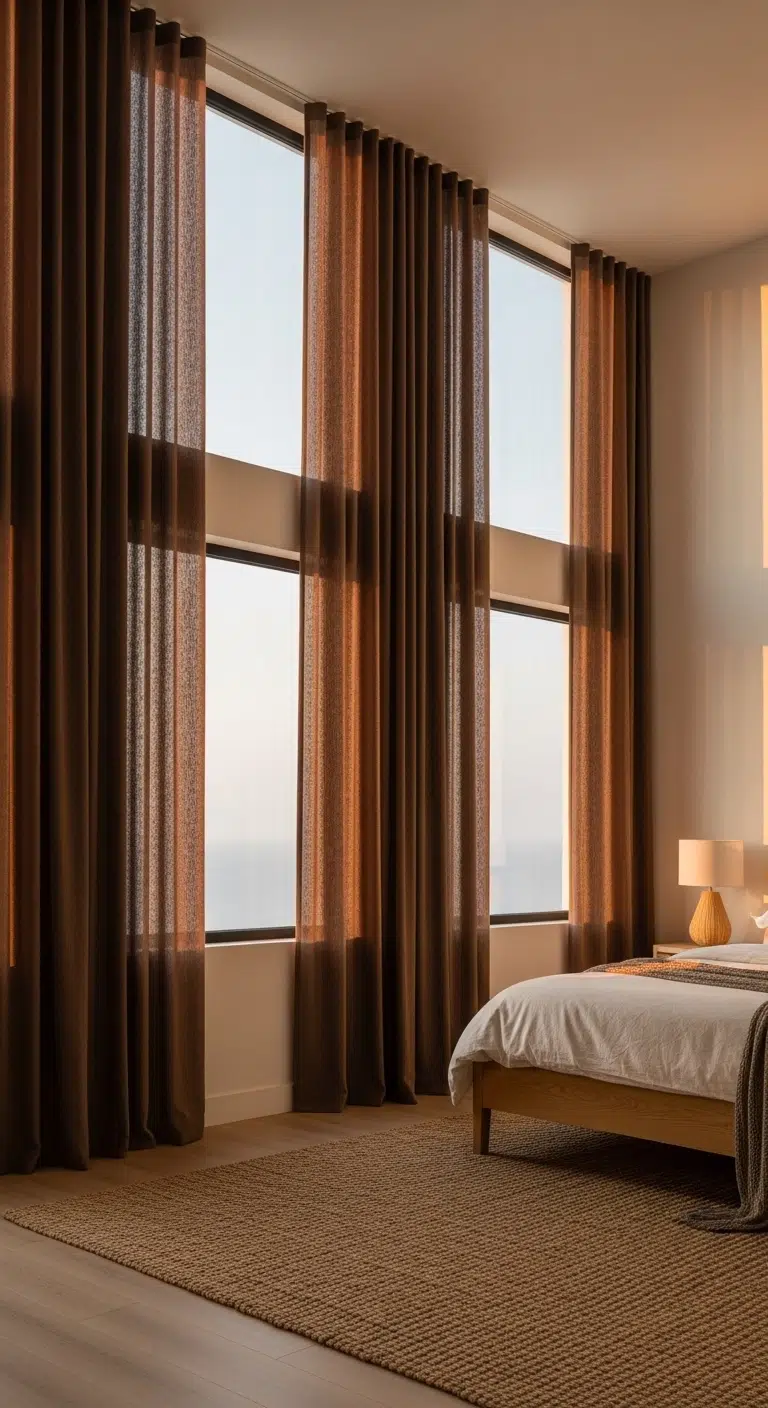 Floor-to-ceiling brown curtains add drama and warmth. The long fabric panels create height and softness. Choose thick linen or velvet for a cozy feel. The deep tone frames windows beautifully. Pair with light walls to prevent heaviness. The room feels intimate and luxurious.