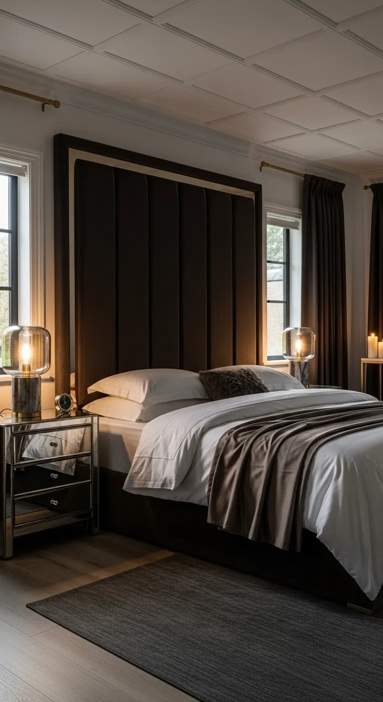 Choose a tall, padded headboard in velvet or linen for added softness and depth. Keep your bedding lighter to prevent the dark brown from overpowering the room. Position wall sconces on each side to frame the headboard beautifully. Add a neutral area rug to soften hardwood floors and connect the tones. If your room lacks natural light, use warm LED bulbs to enhance the brown’s richness. This approach works especially well in medium to large bedrooms.