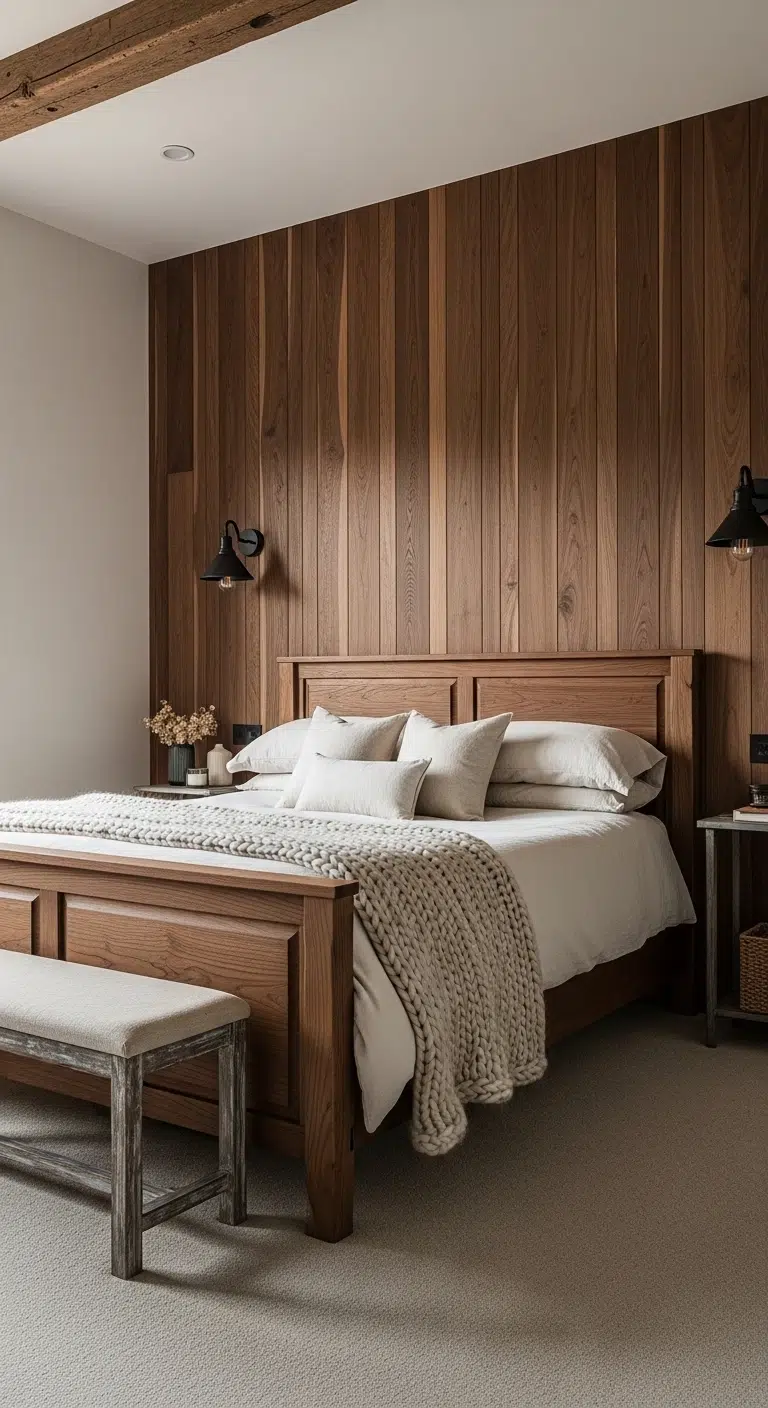 Install vertical wood slats or panels behind the bed for a custom feel. Keep surrounding walls lighter to prevent visual heaviness. Choose minimalist nightstands so the paneling remains the focal point. Add warm recessed lighting above the headboard for a subtle glow. If real wood feels expensive, use high-quality veneer panels for a similar look. This idea works beautifully in both modern and rustic homes.