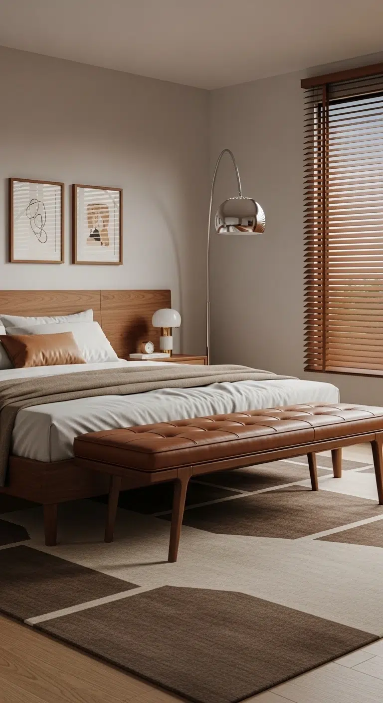 Add a small leather ottoman at the foot of the bed for style and storage. Pair it with linen bedding to balance softness and structure. Choose matte finishes on other furniture to let the leather stand out. If space is tight, even leather drawer pulls can make an impact. Keep surrounding colors neutral to maintain harmony. This detail elevates the room without major renovation.