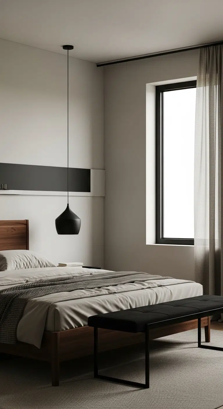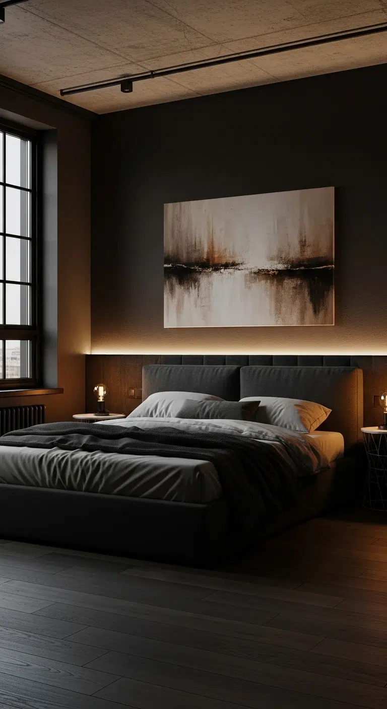 Use wall sconces, table lamps, and hidden LED strips to soften the darkness. Keep your ceiling white or light beige to avoid closing in the space. Choose simple furniture silhouettes to prevent visual clutter. Add reflective elements like mirrors or metallic decor for brightness. This works best in bedrooms with moderate natural light. Proper lighting makes all the difference.
