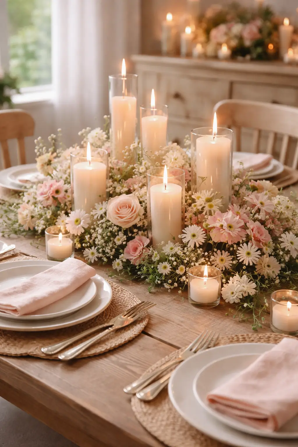 Instead of traditional centerpieces, create a candle garden surrounded by flowers. Place several candles of different heights in the center of the table. Use clear glass holders or soft pastel containers. Around the candles, arrange small clusters of flowers such as daisies, roses, and greenery.