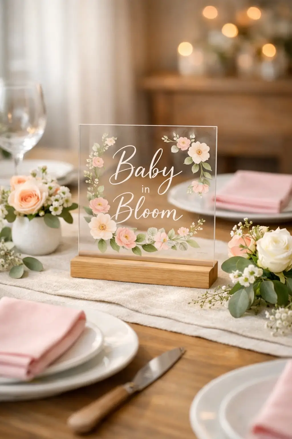 Clear acrylic signs add a modern touch while still fitting the Baby in Bloom theme. Use transparent acrylic boards with printed phrases like “Baby in Bloom” or small welcoming messages. Decorate the corners with small flower arrangements or delicate greenery.