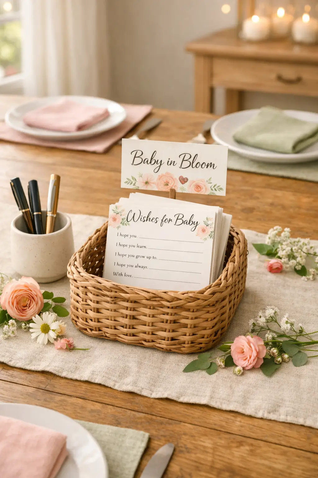 Create a meaningful table detail by adding bloom-themed memory cards. Place small cards on the table where guests can write wishes, advice, or memories for the baby. Decorate the cards with small watercolor flowers or pressed floral designs.
