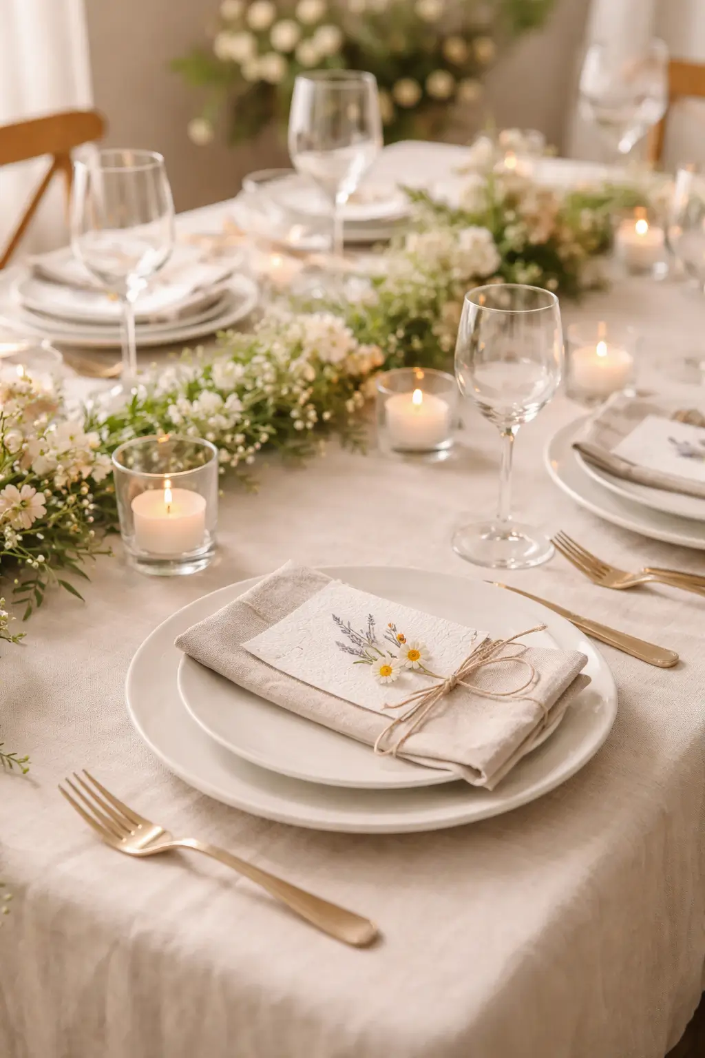 Pressed flowers create a delicate and creative table detail that guests notice right away. Place a single pressed flower on each plate using handmade paper or small transparent cards. Flowers like daisies, pansies, and lavender work beautifully because their colors stay vibrant.