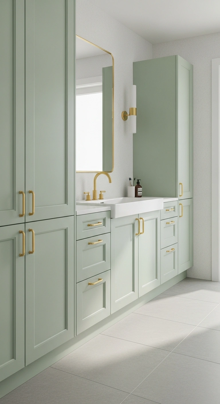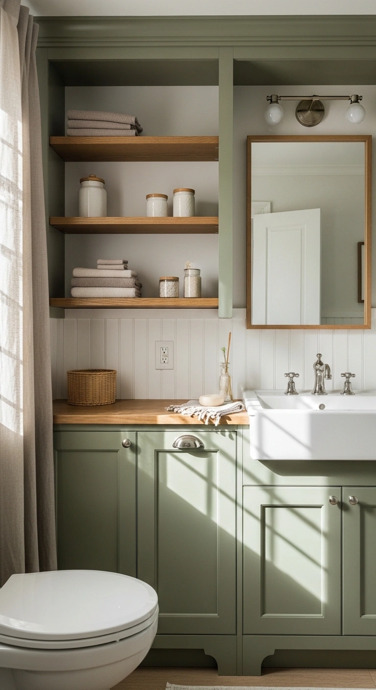 Choose a muted green shade to maintain versatility. Keep open shelves styled with neutral baskets or folded towels. Avoid overcrowding to preserve a clean aesthetic. Add black or brass handles for contrast. Install soft lighting above shelves for dimension. Use light wall colors to prevent heaviness. This design works well in bathrooms needing extra storage.