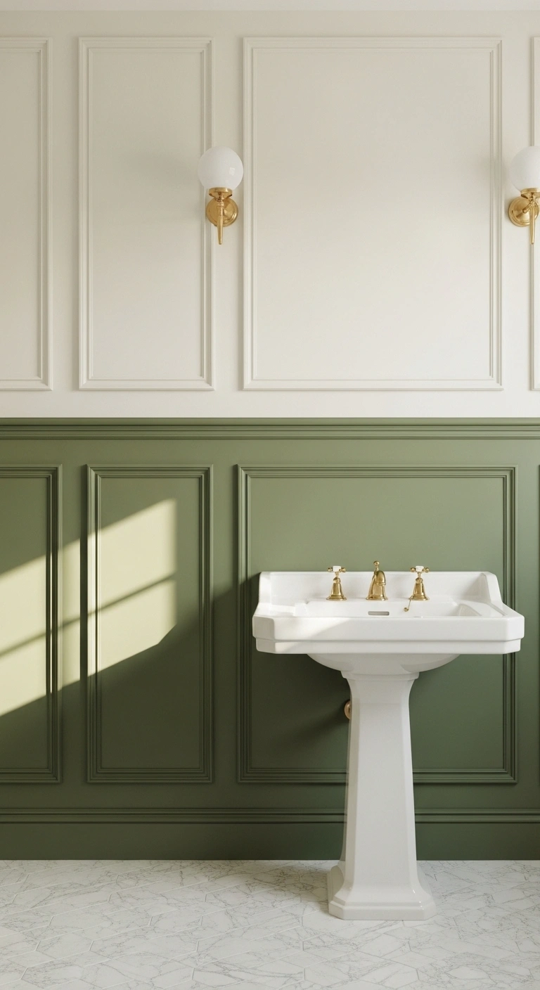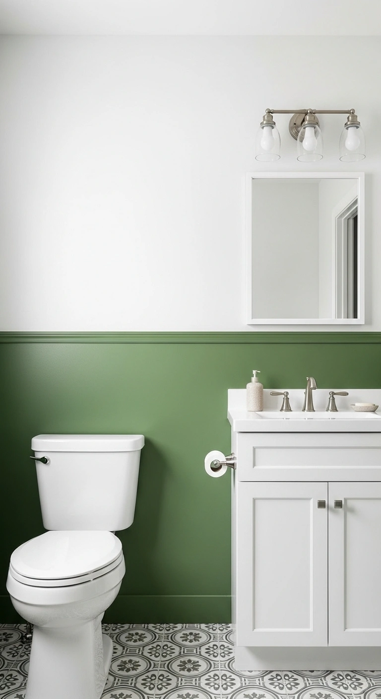 A two-tone green and white wall design adds dimension. The lower half in green anchors the room visually. The upper white portion keeps it bright and airy. This split creates balance without overwhelming the space. Medium greens work especially well for this look. The style feels clean and modern. It works beautifully in compact bathrooms.