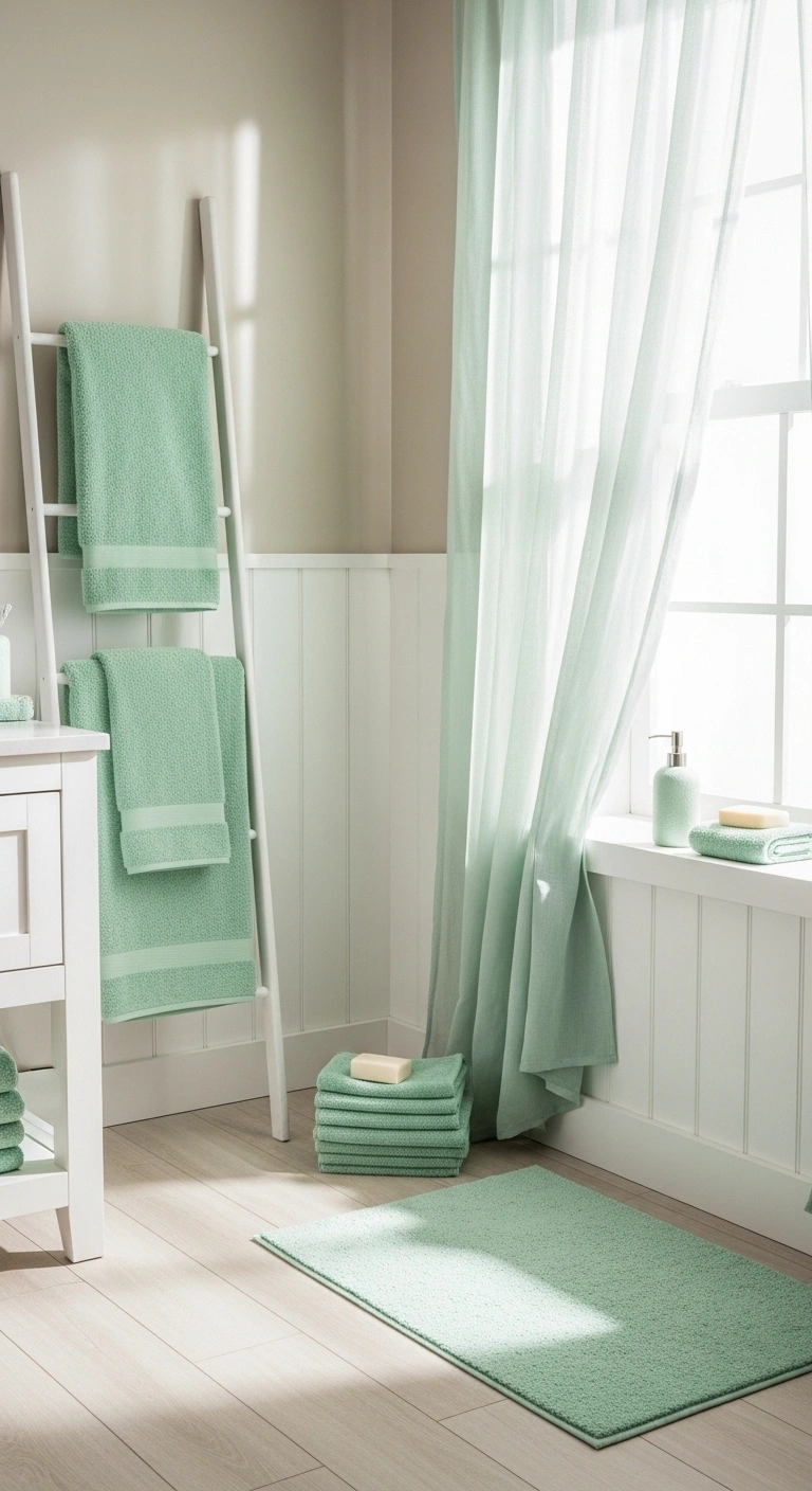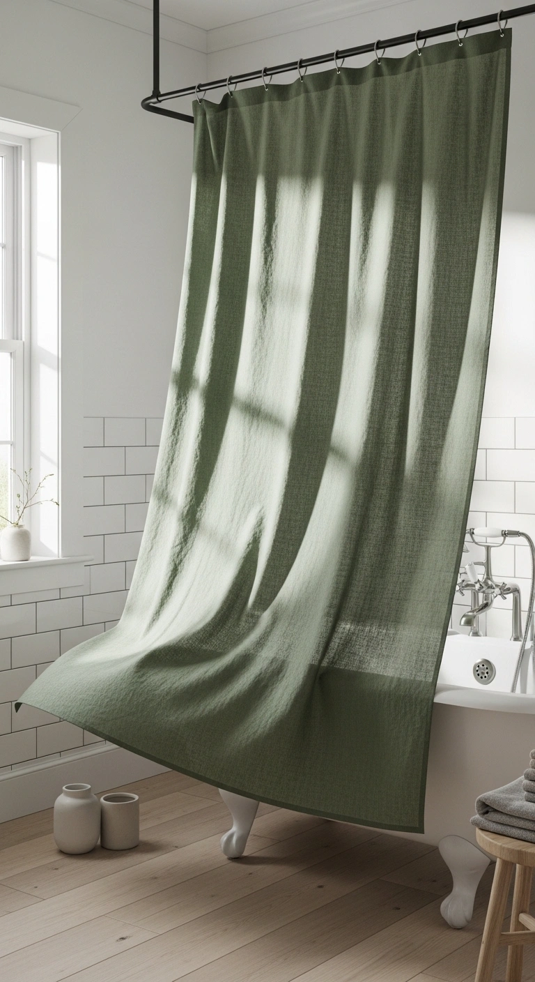 Choose high-quality linen in sage or eucalyptus tones. Hang it higher and wider to create a fuller look. Keep wall colors neutral to avoid clashing shades. Add matching green hand towels for cohesion. Avoid busy patterns to maintain elegance. Use simple curtain rings in brass or black. This approach works perfectly for renters.