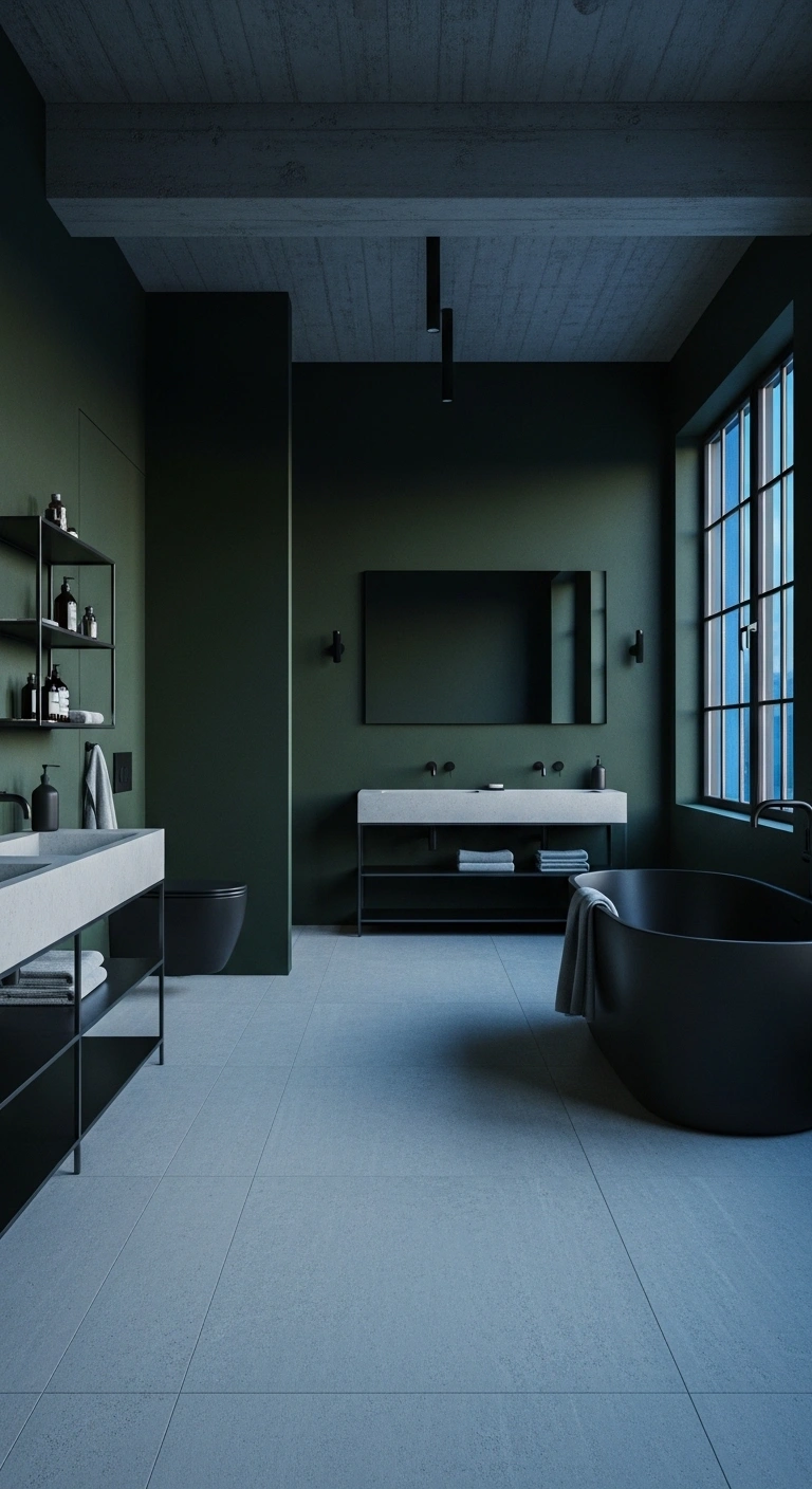 Moody dark green walls create a dramatic and cocooning bathroom atmosphere that feels rich and intentional. This shade works especially well in spaces with good lighting because it absorbs light in a soft, velvety way. When paired with light stone floors, the contrast feels balanced instead of heavy. The deep green adds depth while the pale flooring keeps the room open. Together, they create a grounded yet elegant mood. The space feels luxurious but still connected to nature. This combination instantly makes a basic bathroom feel custom designed.