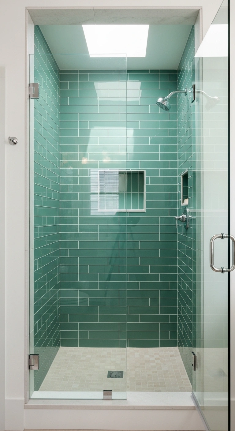 Seafoam green subway tiles create a bright and refreshing shower area that feels airy and clean. This soft blue-green shade reflects light beautifully and makes small bathrooms appear larger. The subtle color variation in glazed tiles adds movement without visual clutter. When stacked horizontally, they create a sense of width and openness. The tone feels coastal but still refined. The overall mood is fresh, calm, and inviting. It transforms a standard shower into a focal point.
