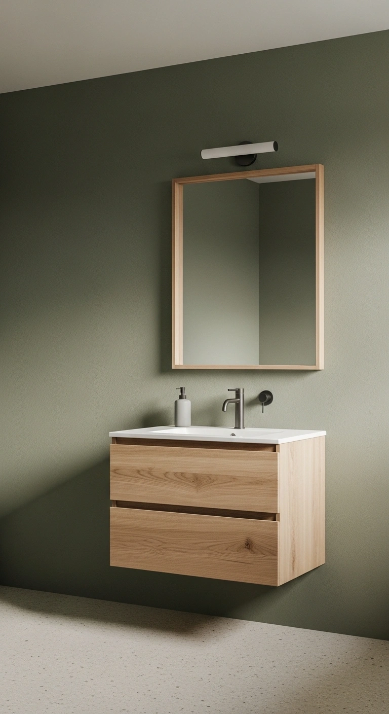 Choose a muted olive or dusty green for walls or cabinetry. Pair it with oak or birch vanities for warmth. Keep hardware simple in matte black or brushed brass. Add woven baskets to enhance texture and storage. Use warm white lighting to bring out the wood tones. Keep decor minimal to highlight natural materials. This idea works well in modern and Scandinavian-inspired bathrooms.