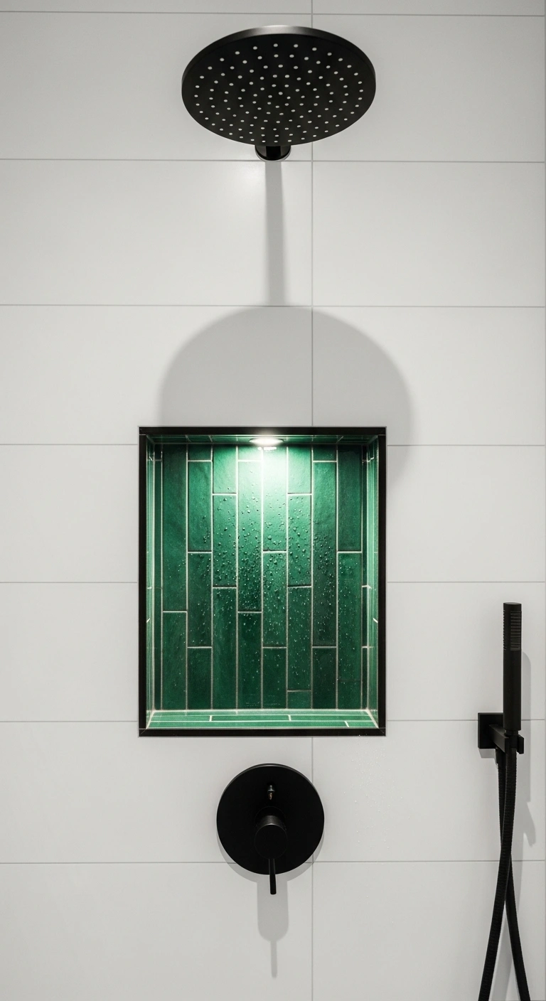 Select a contrasting green tile for the niche only. Keep the main shower walls white or light beige. Add warm LED strip lighting inside the niche for a soft glow. Match accessories like soap bottles to the tile tone. Avoid adding extra decorative clutter nearby. Use clean grout lines for a polished finish. This idea works beautifully in both small and large bathrooms.