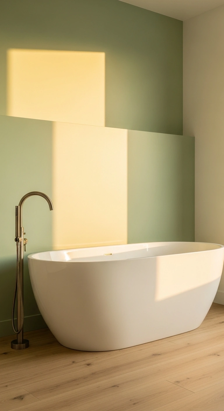A pale green wall behind a freestanding bathtub creates a gentle and elegant focal point. The soft shade highlights the tub without overpowering it. It adds just enough color to feel intentional. When natural light hits the wall, the space feels fresh and airy. The green backdrop makes white tubs stand out beautifully. The mood feels spa-like and calming. It turns bathing into a relaxing visual experience.