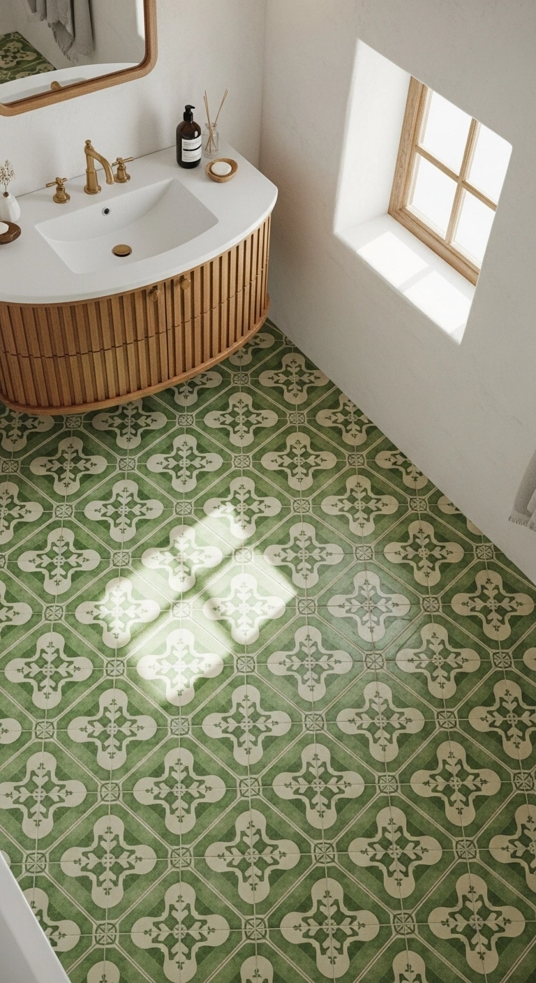 Green patterned floor tiles add movement and personality without requiring bold walls. Subtle geometric or floral patterns create interest underfoot. The green tones can range from soft sage to deeper olive. When balanced with simple walls, the floor becomes the star. Natural light enhances the pattern details throughout the day. The overall effect feels curated and stylish. It adds energy while maintaining elegance.