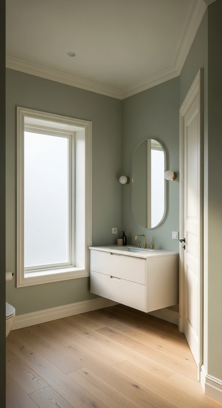 Choose a matte or eggshell paint finish to avoid too much shine on the walls. Pair sage paint with white subway tiles or a simple white vanity for balance. Add brushed brass or champagne gold hardware for warmth and elegance. Light oak floating shelves enhance the natural feel of the color. Use cream or beige towels to keep the palette soft and cohesive. A round mirror with a thin metal frame completes the look effortlessly. Keep decor minimal so the color remains the highlight.