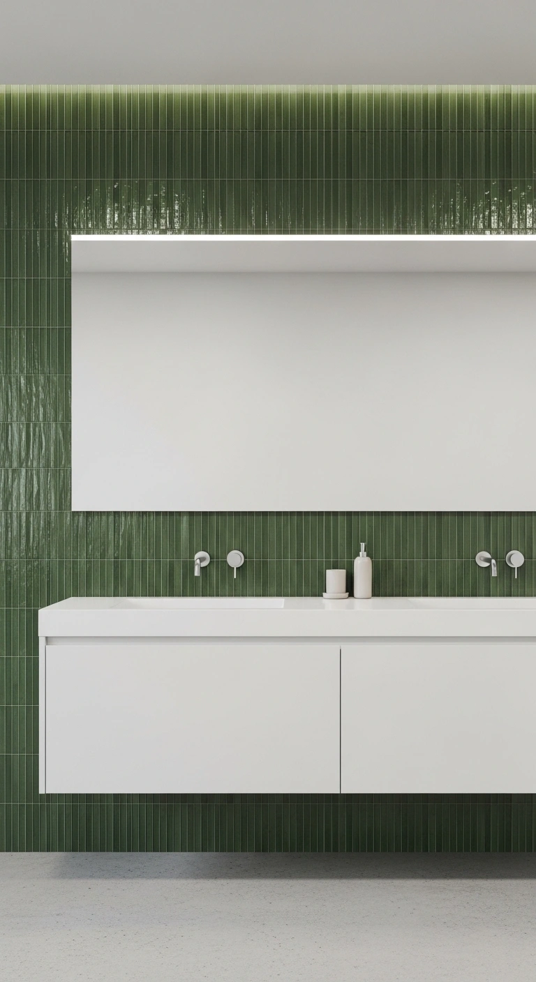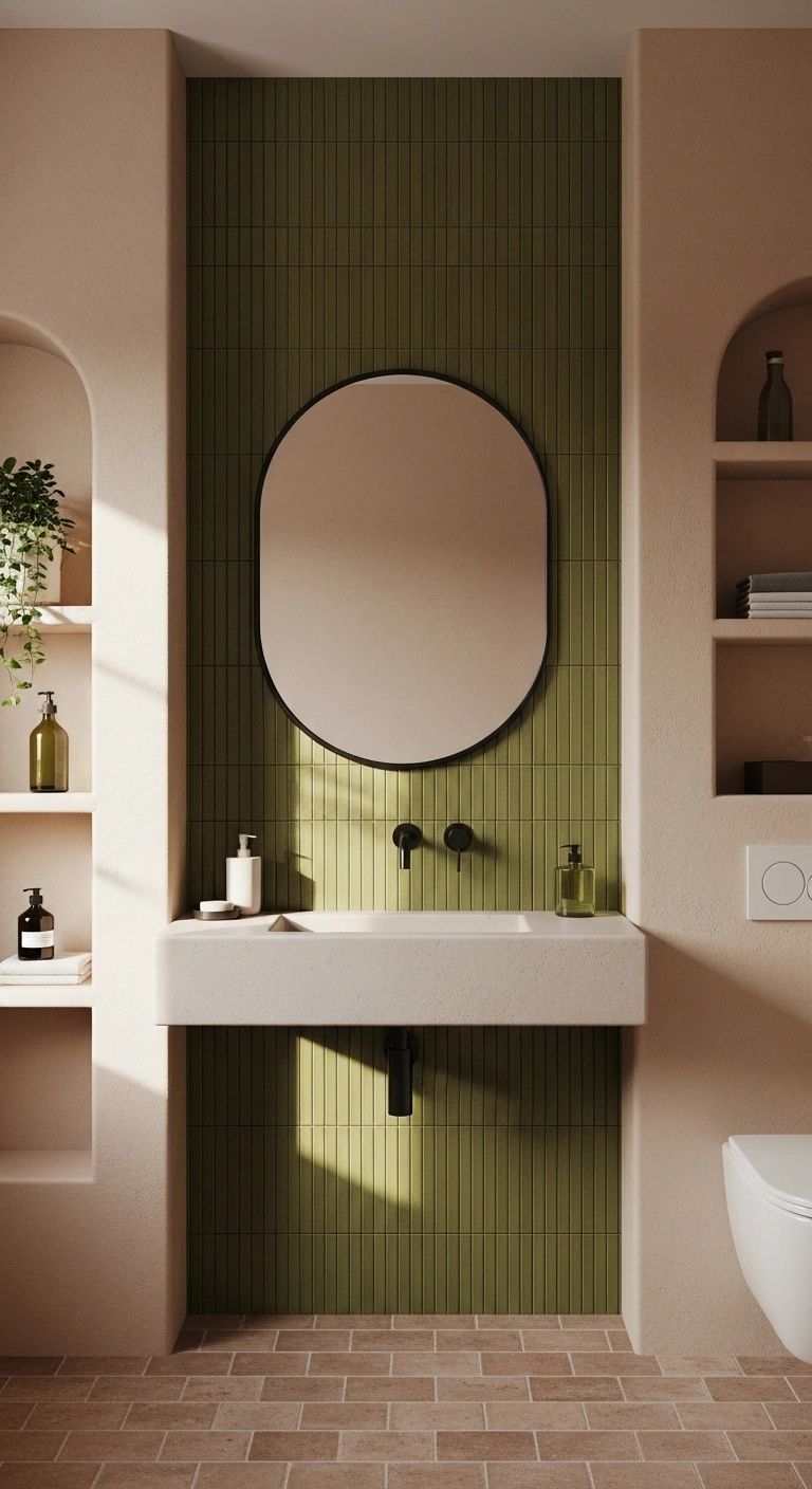 An olive green vertical tile accent wall adds depth and architectural interest. The earthy tone feels grounded and sophisticated rather than trendy. Vertical tiles draw the eye upward, making ceilings appear taller. Olive works beautifully with warm neutrals and natural textures. Glossy tiles reflect light while still maintaining richness. The mood feels organic, modern, and slightly European-inspired. This look feels elevated but not overly decorative.