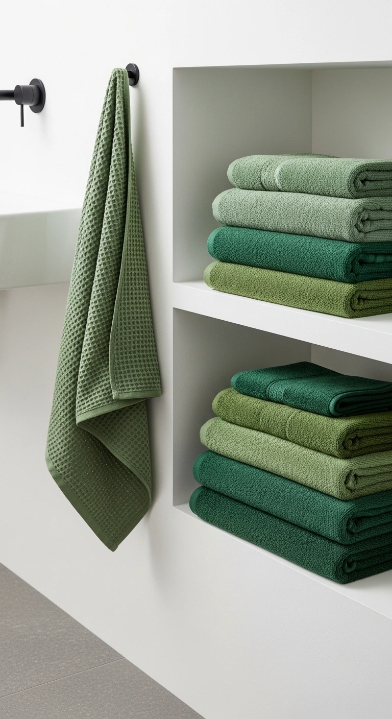 Layered green towels add dimension without altering permanent features. Mixing two or three green shades creates subtle depth. Soft textures like cotton and waffle weave enhance comfort. The different tones catch light differently. This layering makes the bathroom feel styled rather than basic. It introduces color in a flexible way. The overall look feels intentional and cozy.