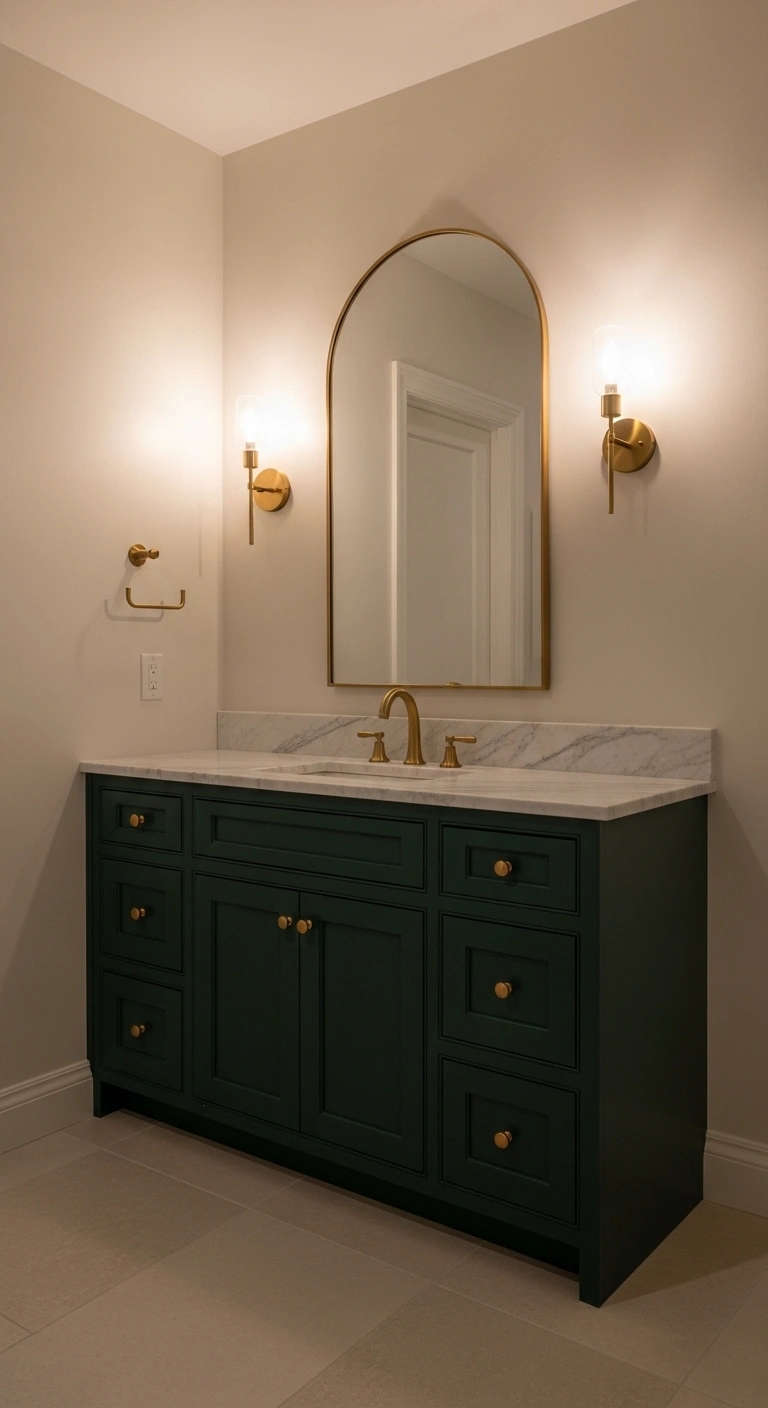 Install brushed gold faucets and cabinet handles. Pair them with sage, olive, or emerald cabinetry. Keep walls neutral to let the contrast shine. Add matching gold mirror frames for cohesion. Avoid mixing too many metals. Use warm lighting to enhance the golden tones. This small upgrade delivers a noticeable impact.