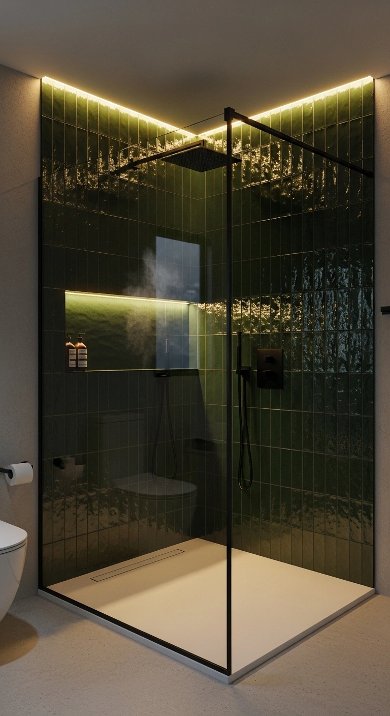 5.Forest Green Shower Tiles with Warm Lighting