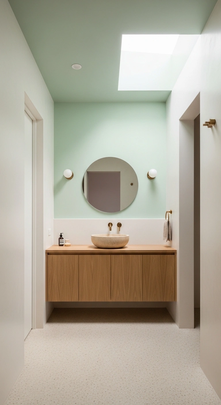 Choose a shade slightly lighter than your wall color. Keep wall decor simple to highlight the ceiling. Use matching green accents in small details like towels. Install warm lighting to soften the tone. Avoid dark floors to maintain balance. A white vanity keeps the design grounded. This idea works well in bathrooms with standard-height ceilings.