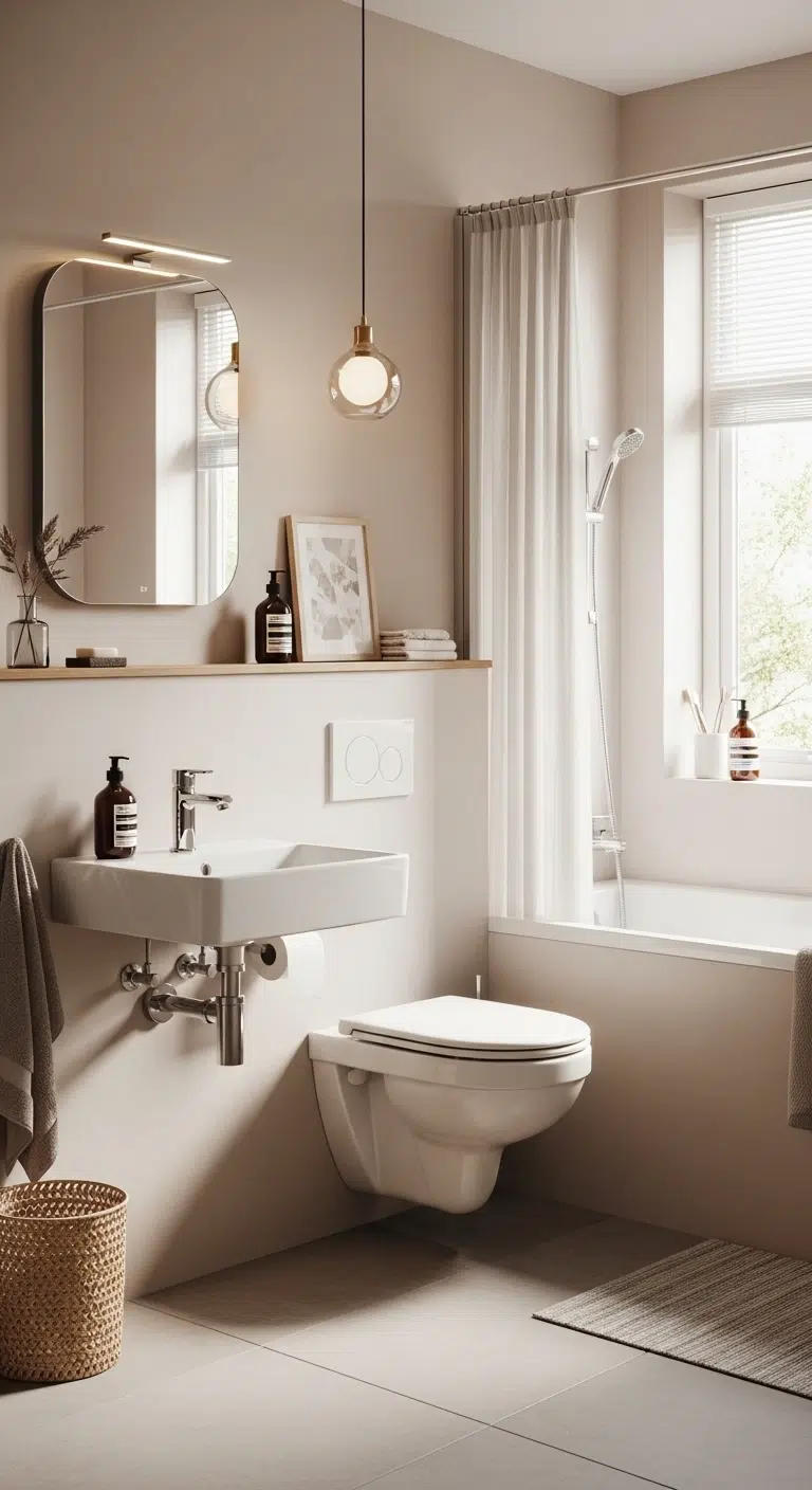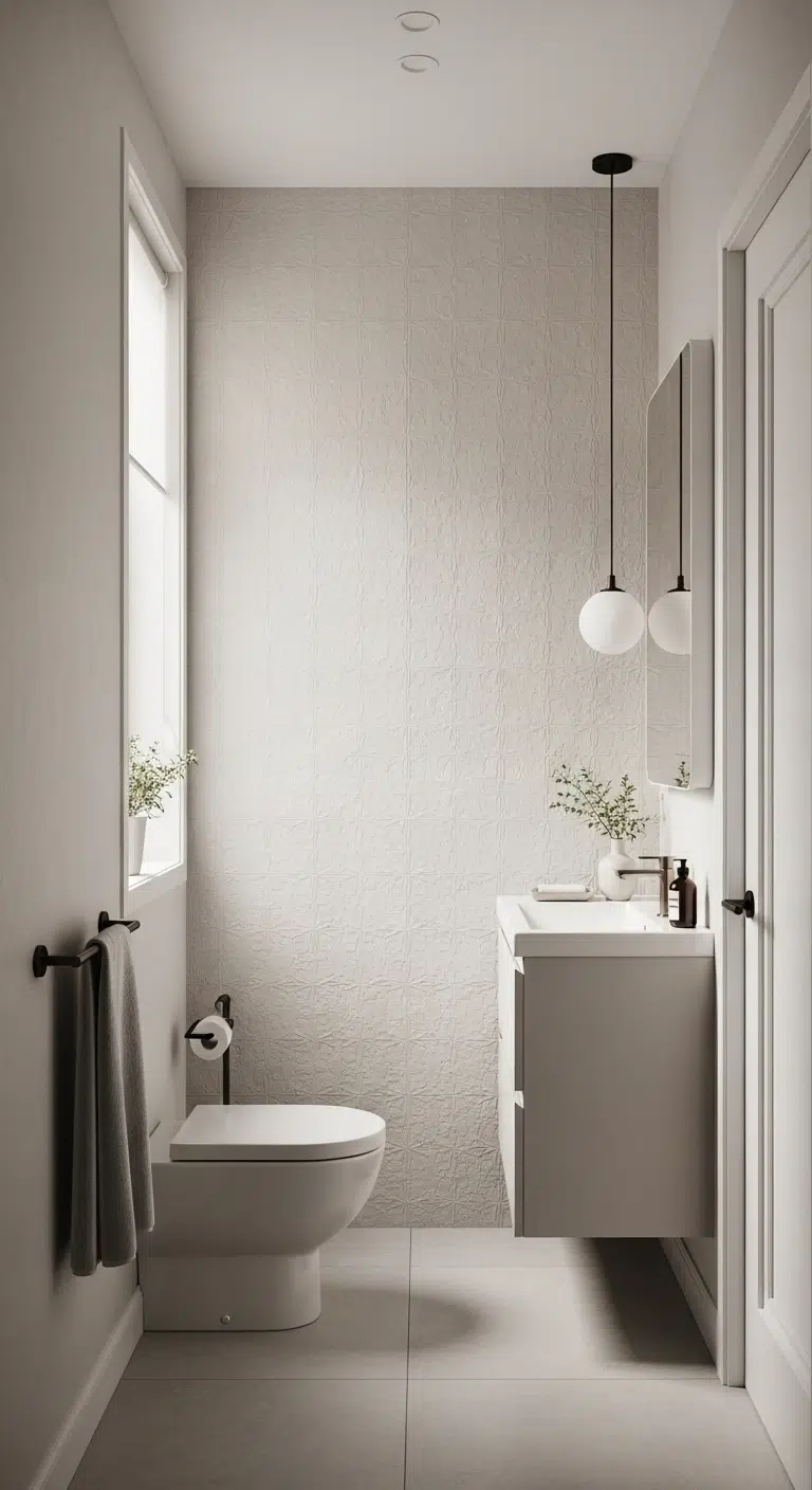 Light colors help reflect light and make a small bathroom feel open. White, cream, soft gray, and pale beige work best as base tones. These colors create a clean and calm atmosphere.Add gentle contrast using textures instead of bold colors. For example, pair matte walls with glossy tiles or mix smooth surfaces with woven baskets. This keeps the design interesting without making the space feel crowded.