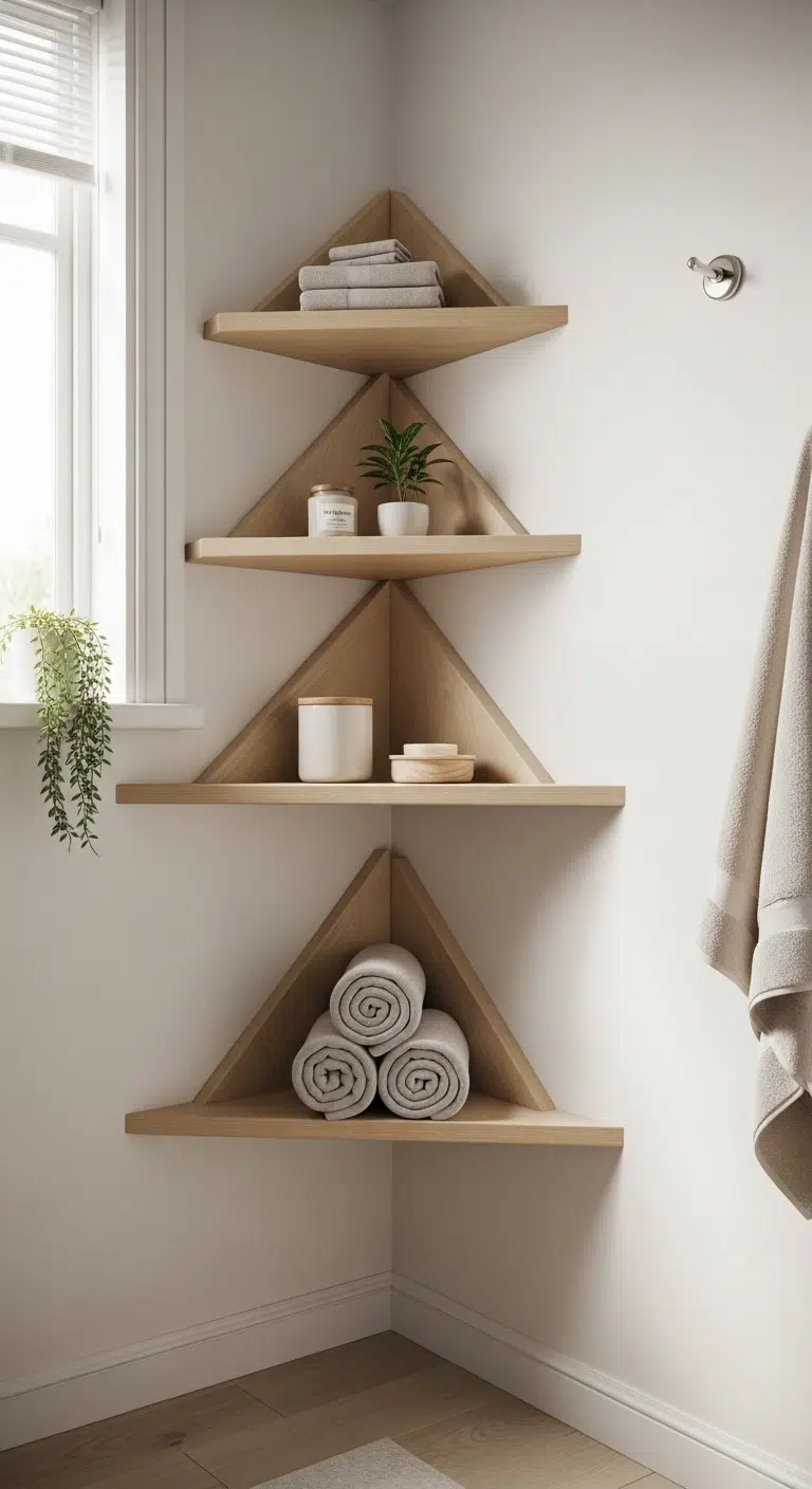 Corners often stay empty, but they hold great potential in a small bathroom. Using corner space helps you add storage without affecting movement. Install corner shelves near the sink or inside the shower to keep daily items within reach.Choose curved or triangular shelves in light wood or white finishes. These shapes fit naturally and avoid sharp edges that can feel bulky. Add small baskets or glass containers to organize items neatly.