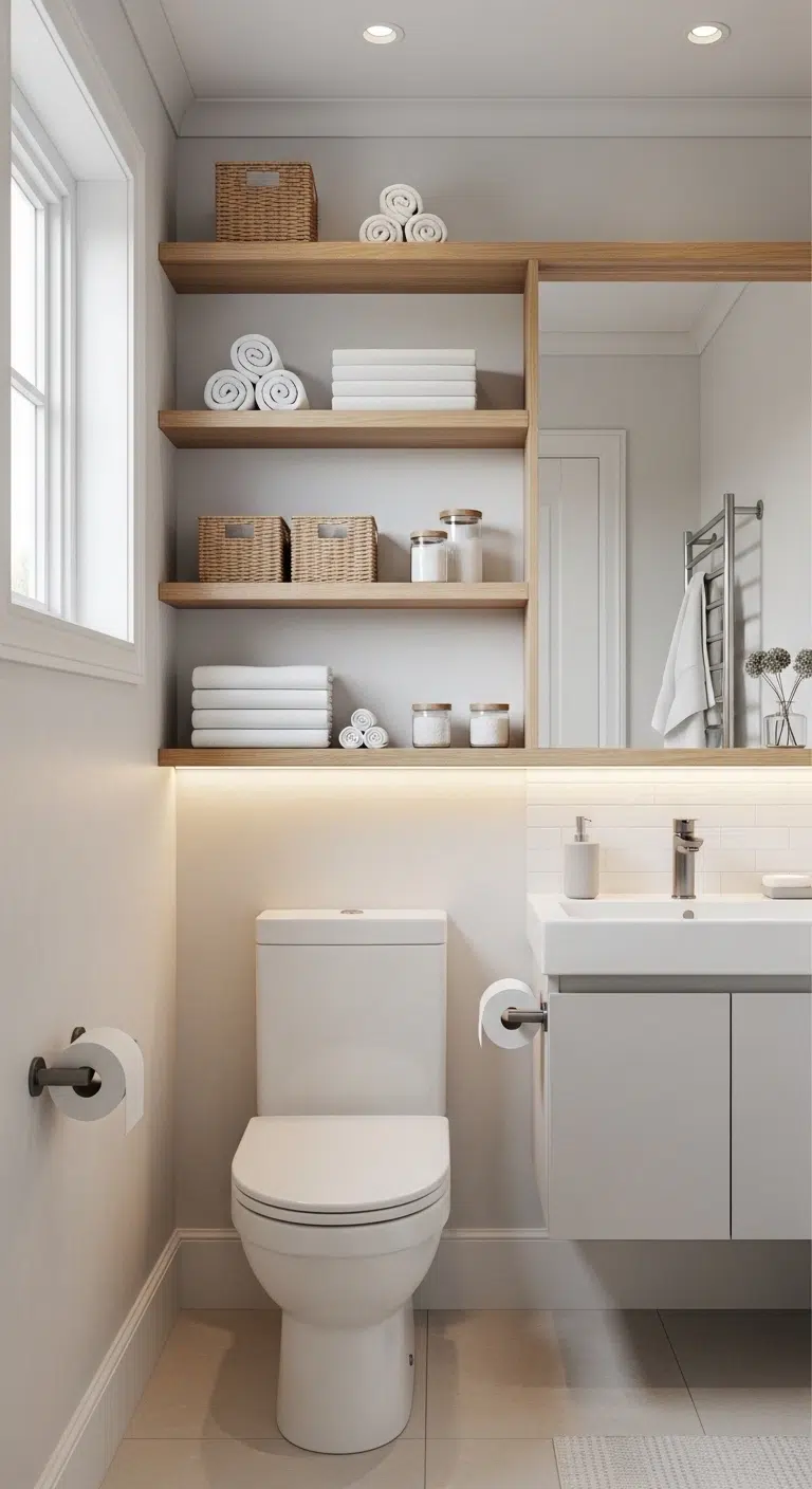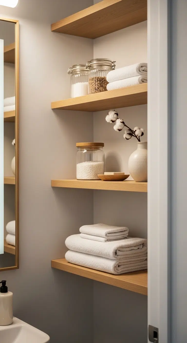 Avoid overcrowding the shelves. Less is more in a small bathroom. Each item should have a purpose or add to the look.This idea blends storage with decor, making your bathroom feel styled without taking extra space.