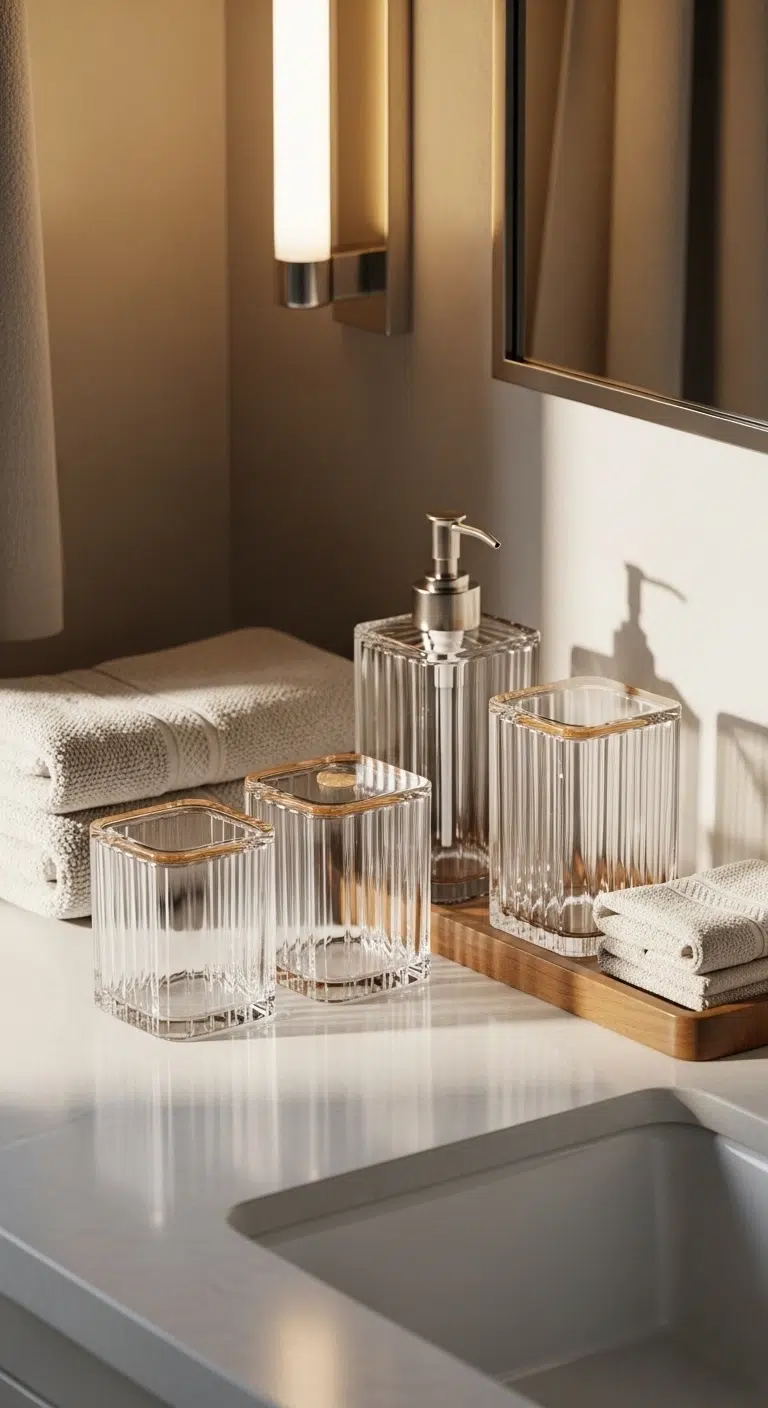 Pair transparent pieces with soft textures like cotton towels or wooden accents. This creates a balanced and inviting feel.Keep everything simple and organized. The goal is to let light pass through and keep the space feeling airy.This idea works well for anyone who wants a clean and minimal bathroom style.