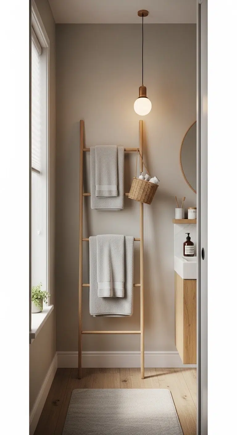 A slim ladder shelf is a smart and stylish storage solution. It leans against the wall and takes up very little floor space. You can use it to hang towels or display small items.Choose a light wood ladder for a warm feel or a white one for a clean look. Place it near the shower or beside the vanity for easy access.