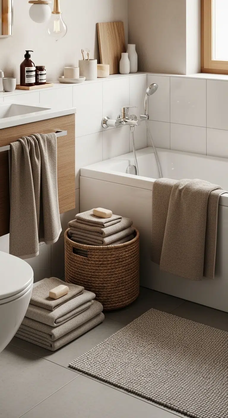 A textured shower curtain or fabric storage bins can also add warmth. Keep patterns simple and subtleThis idea makes your bathroom feel more comfortable while keeping the design clean and stylish.